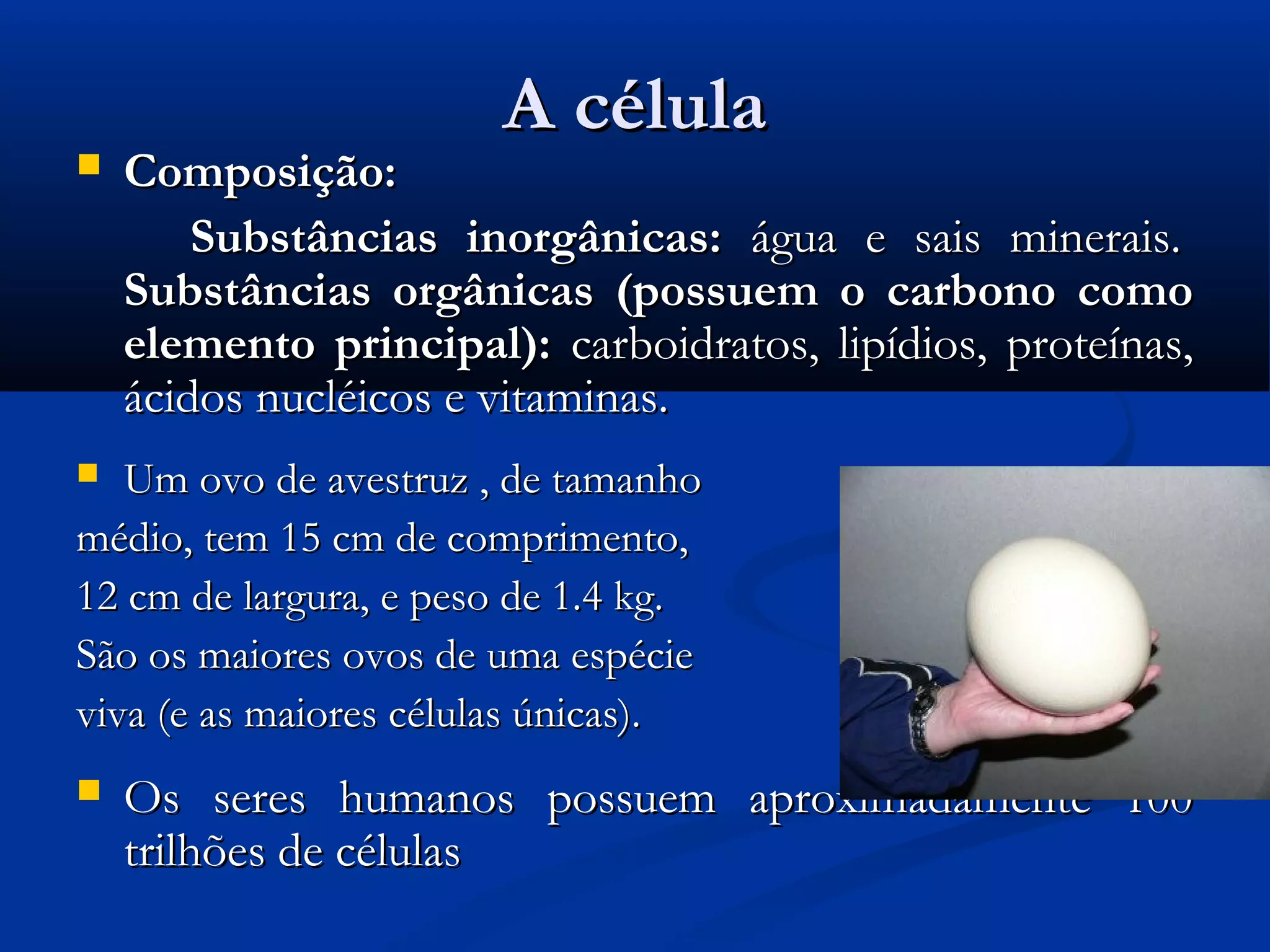 O documento descreve as principais características e componentes da célula, incluindo sua composição, tipos de células e organelas. É explicado que as células são compostas por membrana, citoplasma e núcleo, e contêm diversas organelas como mitocôndrias, retículo endoplasmático e lisossomos que desempenham funções vitais.