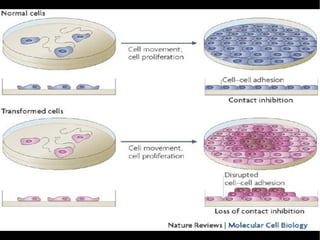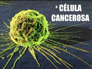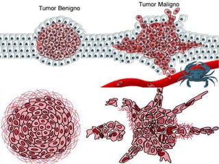 O documento discute as origens e características das células cancerosas. As células cancerosas surgem de mutações no DNA de uma célula normal que faz com que ela se divida de forma descontrolada. Tumores podem ser benignos ou malignos dependendo de sua capacidade de invadir outros tecidos. O documento também explora os conceitos de oncogenes e antioncogenes e como vírus podem contribuir para o desenvolvimento do câncer.