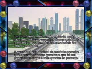 Este documento discute a importância de refletir sobre o propósito da vida e como podemos evoluir espiritualmente através de nossas ações. Ele enfatiza que devemos aproveitar as oportunidades para nos tornarmos melhores pessoas, ajudando os outros com compaixão. Também sugere que quando temos consciência de nossa missão de servir, desenvolvemos força interior para superar os desafios.