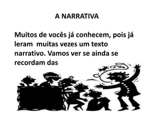 1) A narrativa é um texto oral ou escrito que conta uma história real ou imaginada.