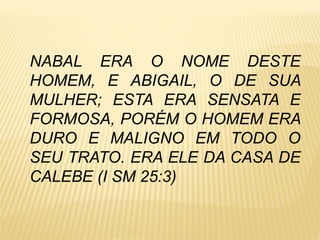 Nabal era um homem duro e maligno que se recusou a ajudar Davi durante a tosquia. Sua esposa Abigail, uma mulher sensata e formosa, tomou medidas para evitar um conflito entre os dois homens, demonstrando coragem, humildade e paz. A história ensina a importância de resolver conflitos com urgência, cuidado e paciência.