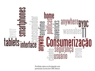 O documento discute a consumerização da TI e o efeito BYOT (Bring Your Own Technology). Apresenta estatísticas sobre o uso crescente de dispositivos pessoais no trabalho e desafios associados, como a necessidade de novas políticas de segurança e suporte. Também aborda tendências como trabalho flexível e mobilidade, e o impacto no Brasil.