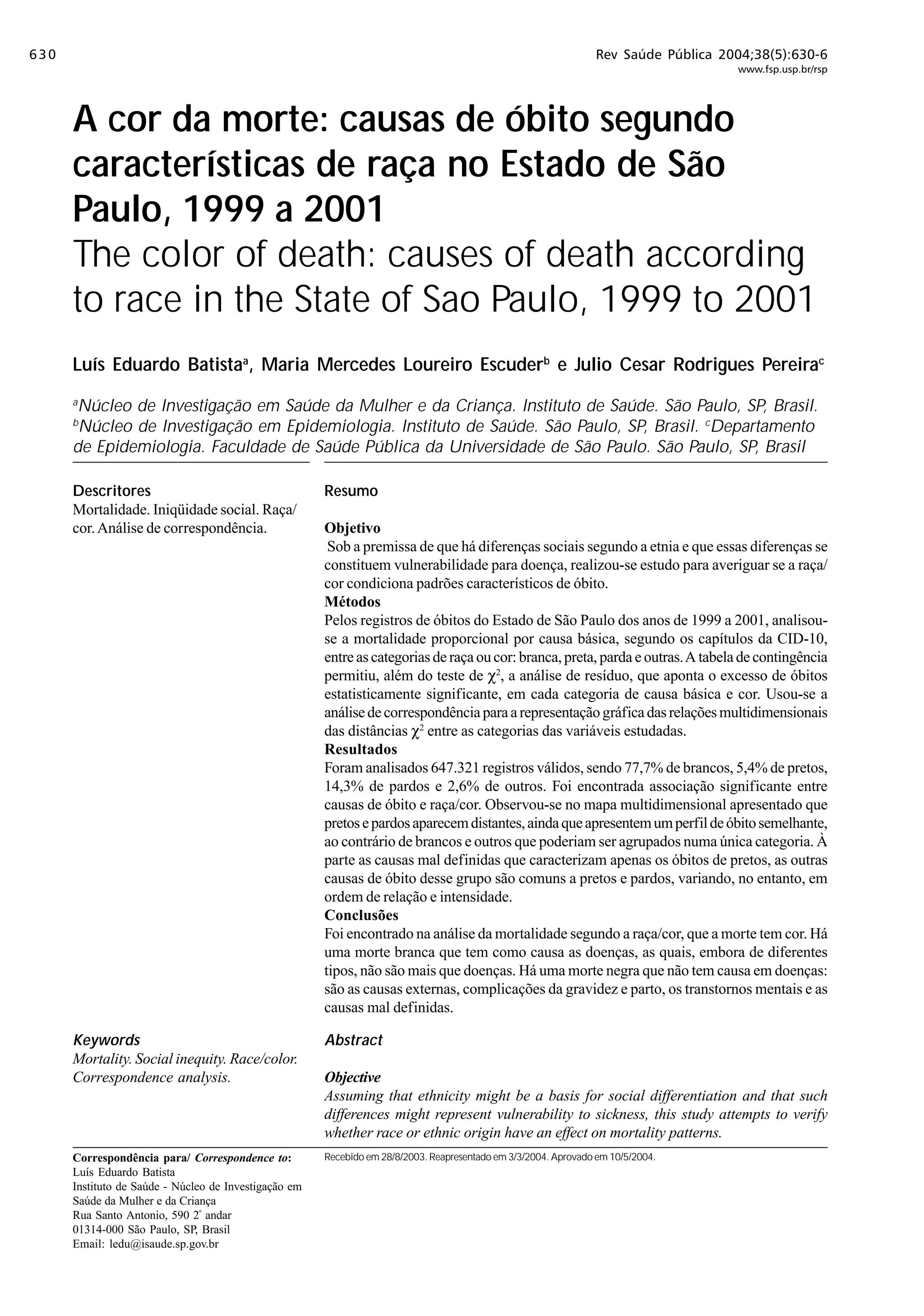 O documento analisa as causas de óbito no Estado de São Paulo de 1999 a 2001 segundo a raça/cor. Foi encontrada associação significativa entre causas de óbito e raça/cor, com perfis de morte diferentes para brancos, pretos e pardos. Pretos e pardos apresentam maior mortalidade por causas externas, complicações na gravidez/parto e causas mal definidas, enquanto brancos apresentam maior mortalidade por doenças.