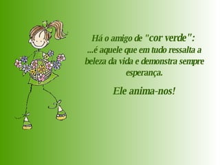 O documento descreve os diferentes tipos de amigos correspondentes às cores do arco-íris. Cada cor representa qualidades únicas que diferentes amigos trazem para nossas vidas, como esperança, paz, alegria, paixão, energia, sabedoria, autoconhecimento e verdade. No final, o documento diz que quando reunimos todos os tipos de amigos coloridos, temos um grande encontro de amor em forma de arco-íris.