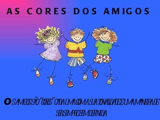 O documento descreve os diferentes tipos de amigos como cores, com cada cor representando características e qualidades únicas. Amigos verdes trazem esperança, azuis trazem paz, amarelos alegram, vermelhos mostram paixão, laranjas fortalecem, cinzentas ensinam, violetas revelam a essência, pretos dizem a verdade com autoridade, e brancos compartilham sabedoria. Juntos, todos os amigos formam um arco-íris de amor.