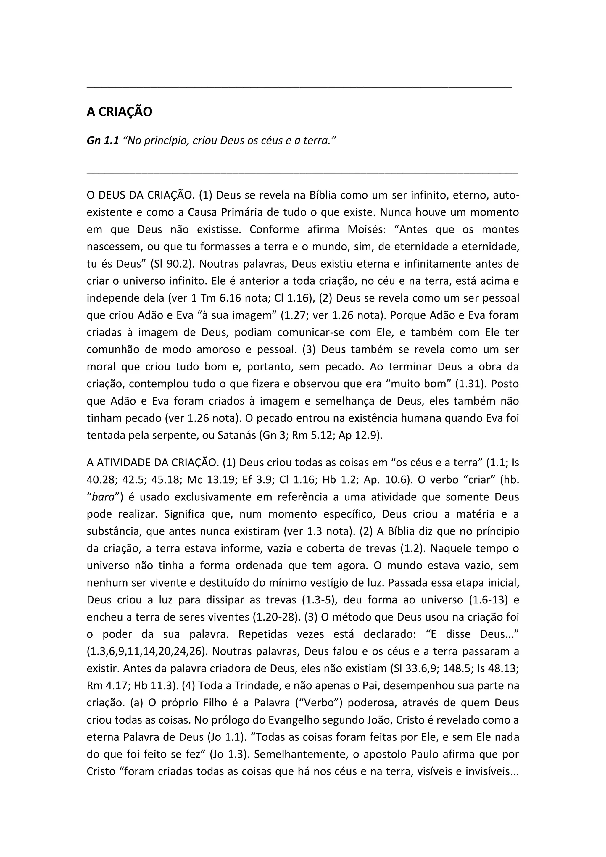 (1) Deus criou o universo e tudo nele de forma ativa e pessoal, não por meio de um processo evolutivo. (2) Deus criou o homem e a mulher à sua própria imagem para ter comunhão com eles. (3) A criação revela a glória e o poder de Deus e foi feita para que ele receba adoração.