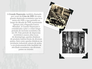A Grande Depressão foi uma grande depressão econômica que começou em 1929 e durou a década de 1930, terminando com a Segunda Guerra Mundial. Isso causou altas taxas de desemprego e quedas drásticas na produção, preços de ações e atividade econômica em muitos países. Seus efeitos foram sentidos globalmente e países como os EUA, Alemanha, Canadá foram duramente atingidos, enquanto a Argentina e o Brasil aceleraram sua industrialização. Os EUA atingiram o pico negativo
