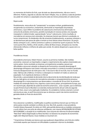 O documento descreve a Crise Econômica de 1929, quando a economia mundial entrou em colapso após um período de crescimento nos EUA. A crise foi desencadeada por uma superprodução que levou a um excesso de mercadorias e subconsumo, resultando em desemprego em massa. O presidente Franklin Roosevelt implementou o New Deal para intervir na economia e estimular o crescimento através de empréstimos, obras públicas e seguro-desemprego.