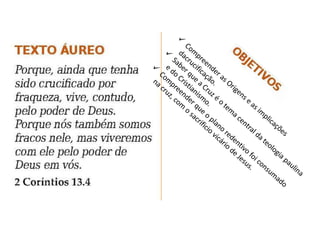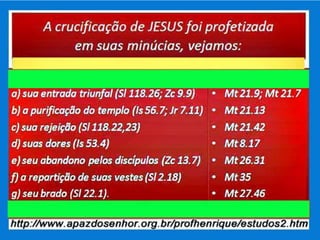 O documento discute a história e significado da cruz de Cristo em 3 seções. A primeira seção descreve a crucificação como um método de execução romano e o sofrimento de Jesus no caminho da cruz. A segunda seção explora as profecias cumpridas na crucificação de Jesus e seu cumprimento da obra redentora. A terceira seção examina como Paulo via a crucificação como o ponto alto da salvação e a resposta de Deus ao pecado do homem.