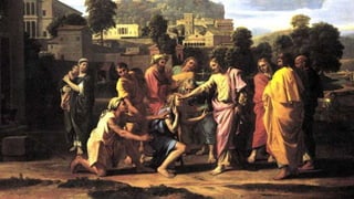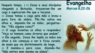 O documento descreve a cura de um cego em Betsaida realizada por Jesus em dois estágios: primeiro Jesus tocou o cego e depois impôs as mãos nele. A cura ensina que devemos agir como intermediários para ajudar outros a encontrarem a cura espiritual, aplicando recursos como o passe e a prece.