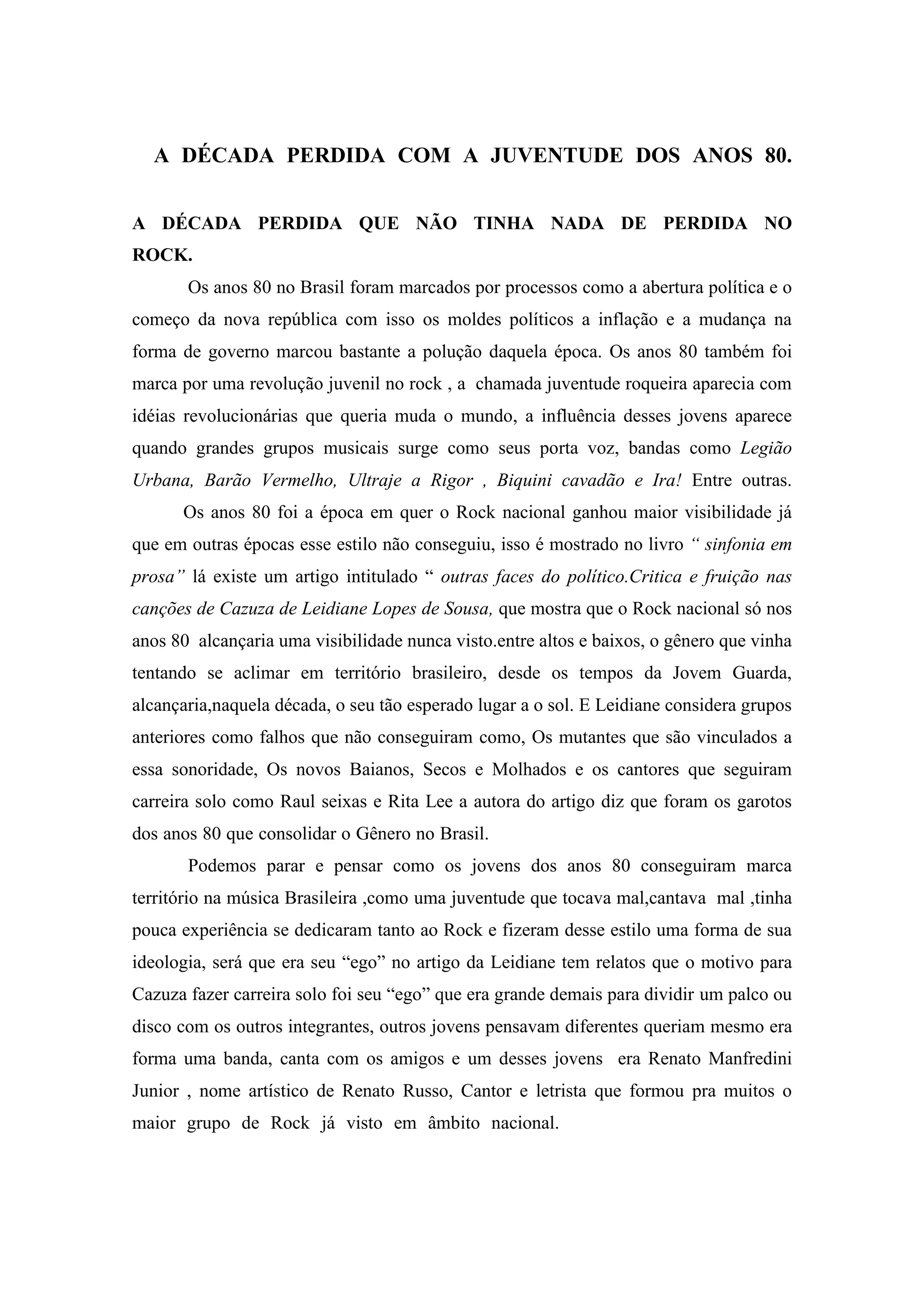 1) O documento discute a década de 1980 no Brasil e o papel do rock na juventude da época. 2) Os anos 1980 foram marcados por processos políticos como a abertura e a nova república, e também pela ascensão do rock entre a juventude. 3) Bandas como Legião Urbana, Barão Vermelho e Ira! deram voz às ideias revolucionárias da juventude e ajudaram o rock a ganhar maior visibilidade no Brasil.