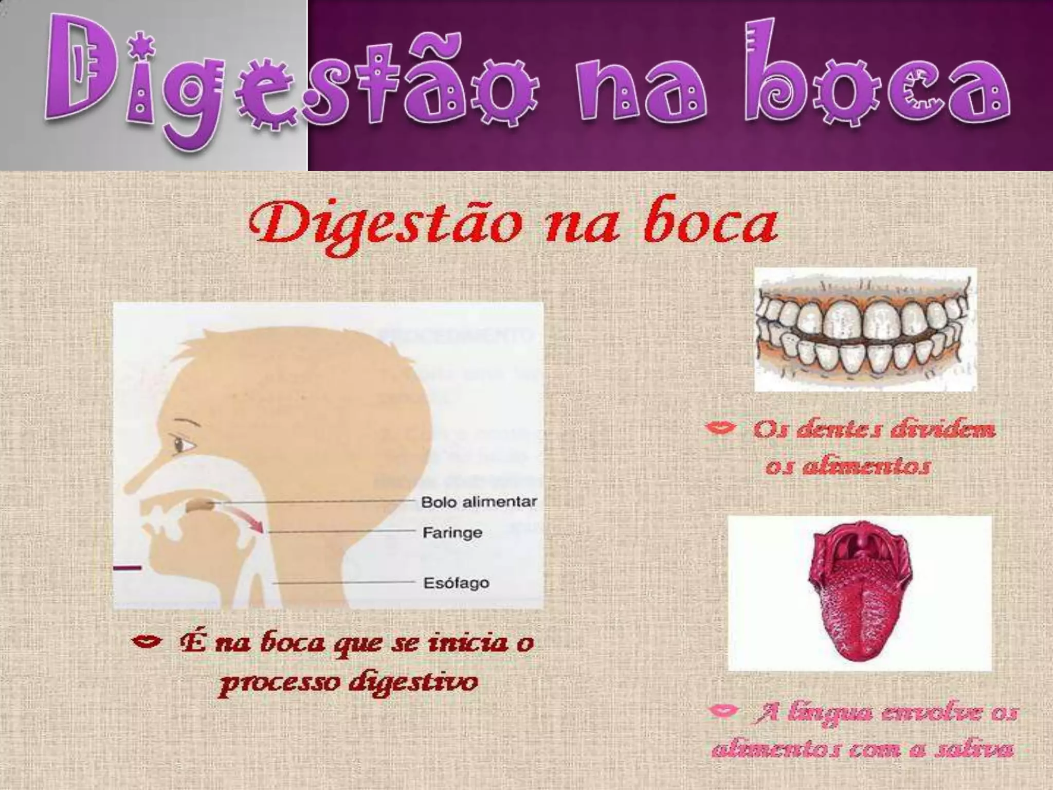 A digestão começa na boca, onde os dentes mastigam os alimentos em um bolo alimentar e as glândulas salivares adicionam saliva para ajudar na digestão inicial dos carboidratos, enquanto a língua empurra o bolo alimentar para a faringe.
