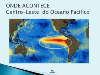 O documento descreve vários fenômenos climáticos como o efeito cebola, El Niño e La Niña. El Niño causa o aquecimento das águas do Pacífico e anos secos em algumas regiões, enquanto La Niña traz o resfriamento das águas e mais chuvas no Nordeste brasileiro. Esses fenômenos afetam os padrões de chuva e temperatura globalmente e podem prejudicar a agricultura.