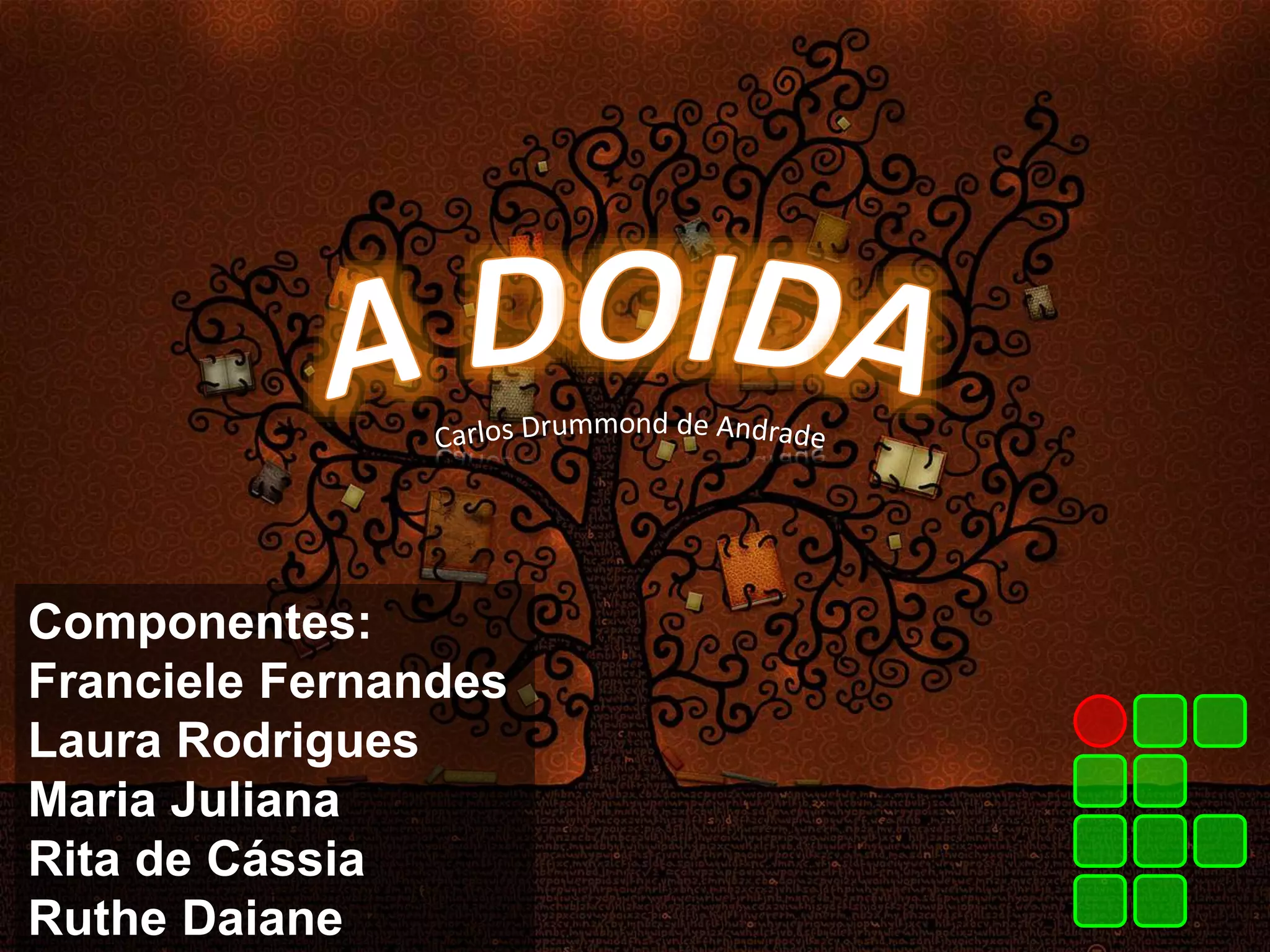 O documento descreve Carlos Drummond de Andrade, um poeta brasileiro do século XX. Ele nasceu em Minas Gerais e foi um dos principais poetas do Modernismo Brasileiro. O texto também resume o conto "A Doida", contando a história de uma mulher isolada da cidade que as crianças costumavam provocar, até que um menino entra em sua casa e vê sua humanidade.