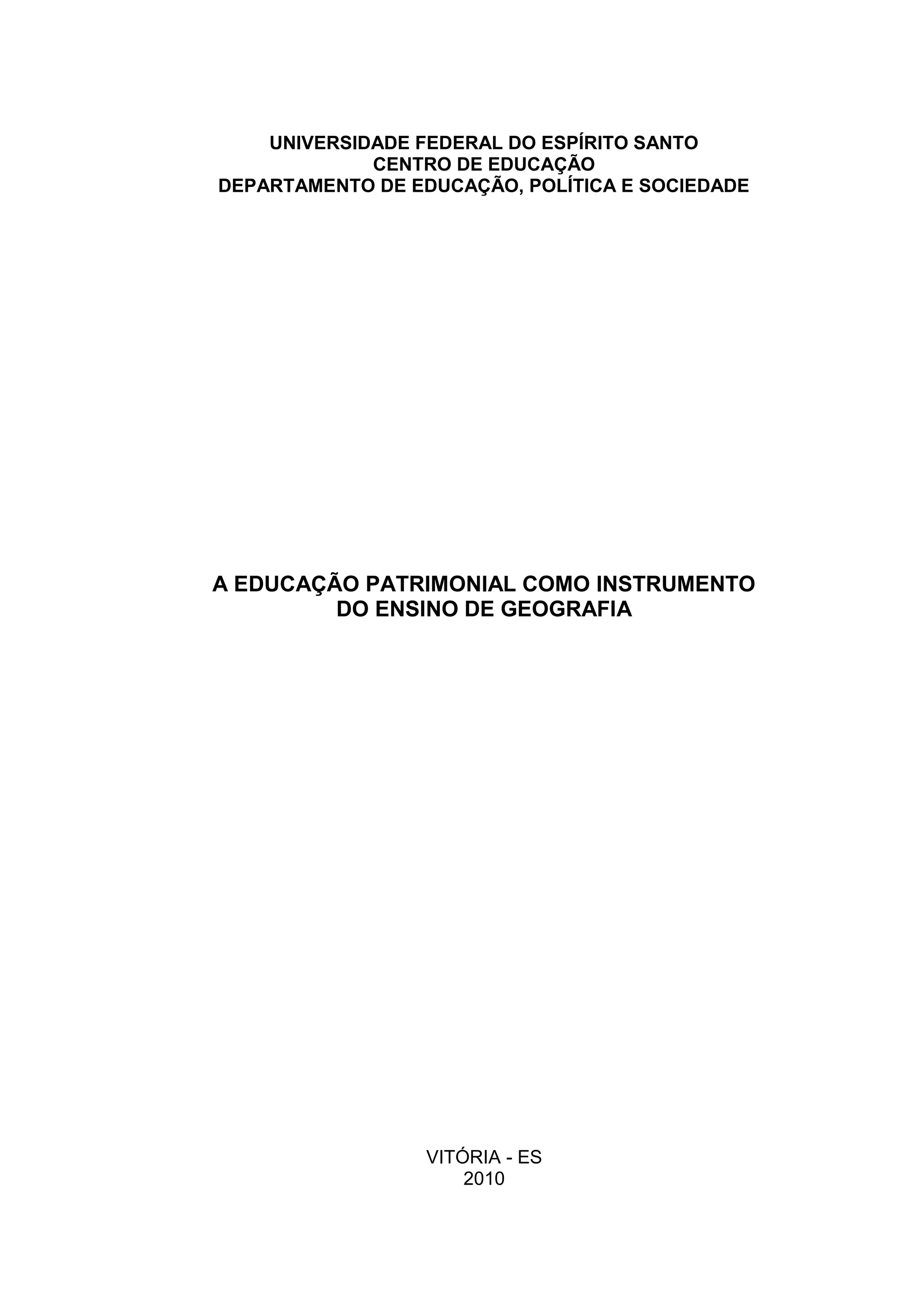 Este trabalho apresenta um guia para professores sobre como utilizar a educação patrimonial como instrumento no ensino de geografia. O guia foi desenvolvido para auxiliar professores do 7o ano do ensino fundamental na Região Metropolitana da Grande Vitória no Espírito Santo. O trabalho discute como a educação patrimonial pode ajudar os alunos a compreenderem os conceitos-chaves da geografia como lugar, paisagem e espaço geográfico através do estudo do patrimônio cultural local e suas transformações ao longo do tempo.