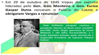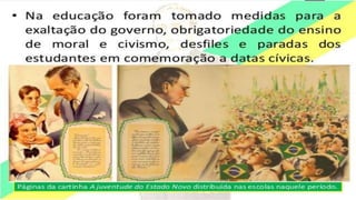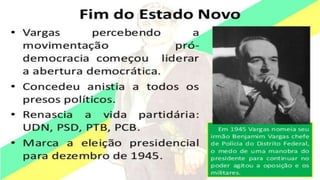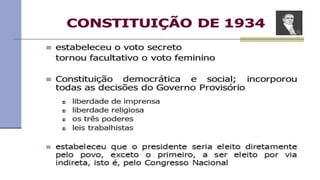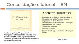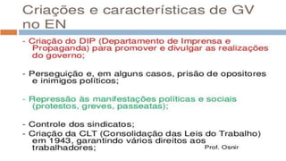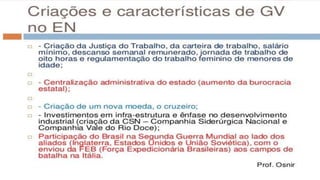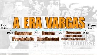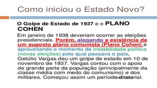O documento resume a Era Vargas no Brasil, começando pela queda da República do Café com Leite em 1930 e a ascensão de Getúlio Vargas ao poder. Detalha os principais eventos do seu governo provisório e constitucional, incluindo a Intentona Comunista de 1935 e o Golpe de 1937 que implantou a ditadura do Estado Novo.