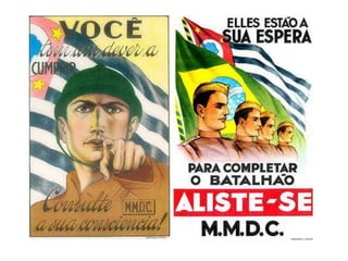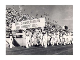 O documento descreve as transformações sociais e políticas no Brasil na década de 1920 e a ascensão de Getúlio Vargas ao poder com a Revolução de 1930, inaugurando a Era Vargas. Vargas primeiro governou de forma provisória e depois instituiu o Estado Novo, uma ditadura que durou até 1945, quando Vargas foi forçado a renunciar devido à pressão da oposição.
