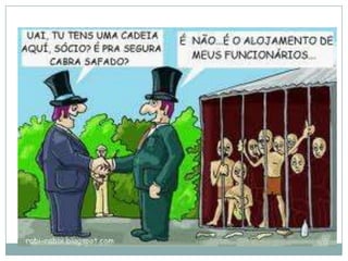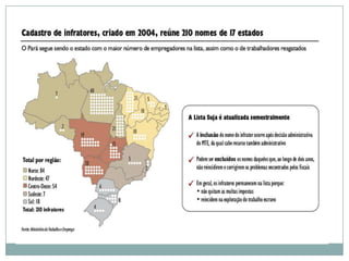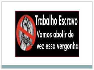 O documento discute a persistência da escravidão em diversos países e setores econômicos. A OIT estima que existam pelo menos 12,3 milhões de pessoas submetidas ao trabalho forçado no mundo. A escravidão ocorre na agricultura, construção civil e indústrias têxtil e alimentícia em locais como China, Índia, Suécia e Estados Unidos. No Brasil, 40 mil trabalhadores foram libertados desde 1995, porém o problema permanece, especialmente no Pará.