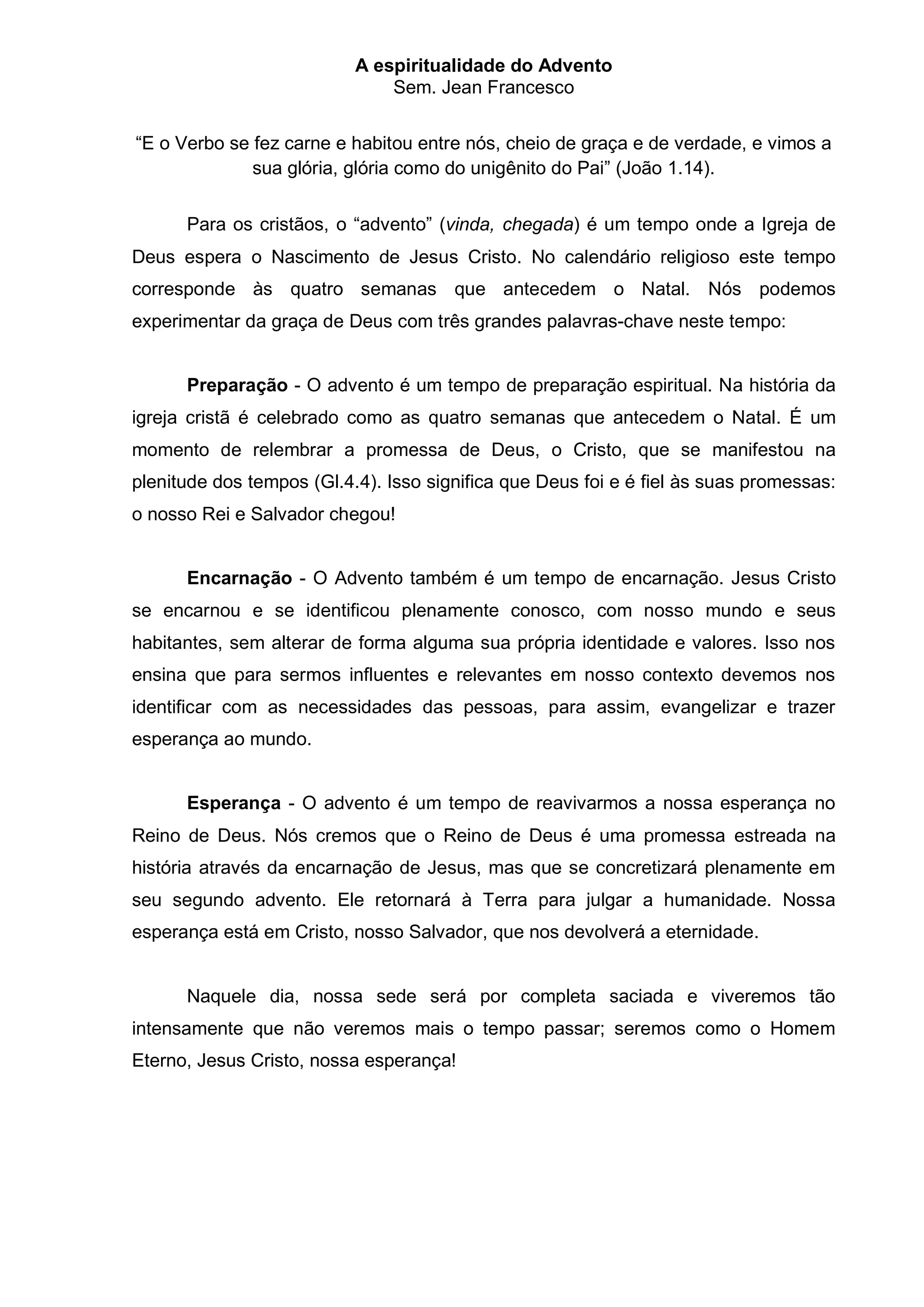 O documento discute a espiritualidade do Advento em três palavras-chave: 1) Preparação, como um tempo para se preparar espiritualmente para o nascimento de Jesus Cristo; 2) Encarnação, como Jesus se encarnou e se identificou com a humanidade; 3) Esperança, como o Advento é um tempo para reavivar a esperança no Reino de Deus que se concretizará no segundo advento de Cristo.