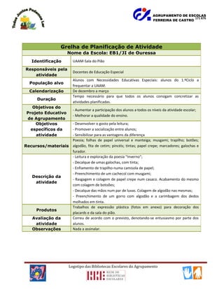 Este documento descreve uma atividade realizada na sala do Pião da EB1/JI de Ouressa com alunos com Necessidades Educativas Especiais. A atividade envolveu a leitura de uma poesia e várias tarefas expressivas como decalques, colagens e preenchimentos para produzir trabalhos decorativos. A avaliação indicou que a atividade correu como planeado e que os alunos mostraram entusiasmo.