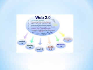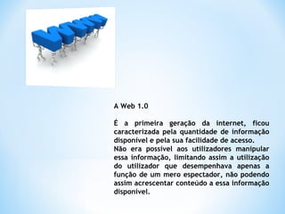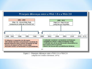 O documento descreve a evolução da Web, da Web 1.0 para a Web 2.0. A Web 1.0 era caracterizada por informação disponível, mas os usuários não podiam manipulá-la ou adicionar conteúdo. A Web 2.0 surgiu em 2003 e permitiu a colaboração e interação entre usuários através de wikis, blogs e redes sociais, onde as pessoas podiam publicar e compartilhar conteúdo.