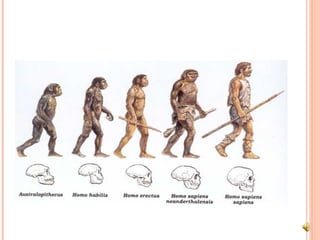 O documento resume a evolução do homem desde o Dryopithecus há 20 milhões de anos até o Homo Sapiens moderno, explicando como espécies como o Australopithecus, Homo Habilis, Homo Erectus e o Homo Neanderthalis evoluíram e eventualmente se extinguiram, deixando o Homo Sapiens como a única espécie remanescente.