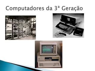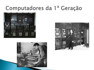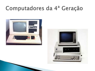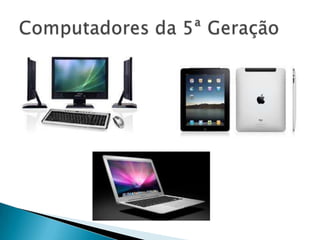 O documento descreve as cinco gerações de computadores, começando com os primeiros computadores de válvulas eletrônicas na primeira geração e progredindo para computadores cada vez menores, mais rápidos e com maior capacidade de armazenamento à medida que novas tecnologias como transistores, circuitos integrados e microprocessadores foram desenvolvidos. A quinta geração se caracteriza por computadores capazes de reconhecimento de voz e aprendizagem.