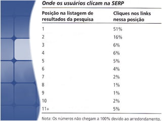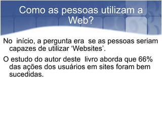 O documento discute como os usuários interagem com sites na web com base em uma pesquisa. Os usuários geralmente passam pouco tempo em cada site antes de mudar para outro se não encontrarem o que procuram, e tendem a visitar apenas os primeiros resultados em buscas na web. Projetar sites para fornecer informações úteis rapidamente e facilitar a navegação entre páginas aumenta a probabilidade de retenção dos usuários.