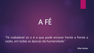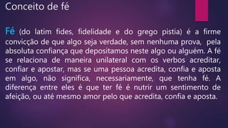 A fé é uma convicção firme sem necessidade de provas, relacionada à confiança e amor pelo que acreditamos. No contexto de ensinamentos cristãos, a fé é vista como uma virtude que promove coragem e esperança, sendo capaz de realizar o impossível através da confiança em Deus. Ela deve ser cultivada e desenvolvida, funcionando como uma semente que precisa de cuidados para crescer e dar frutos.