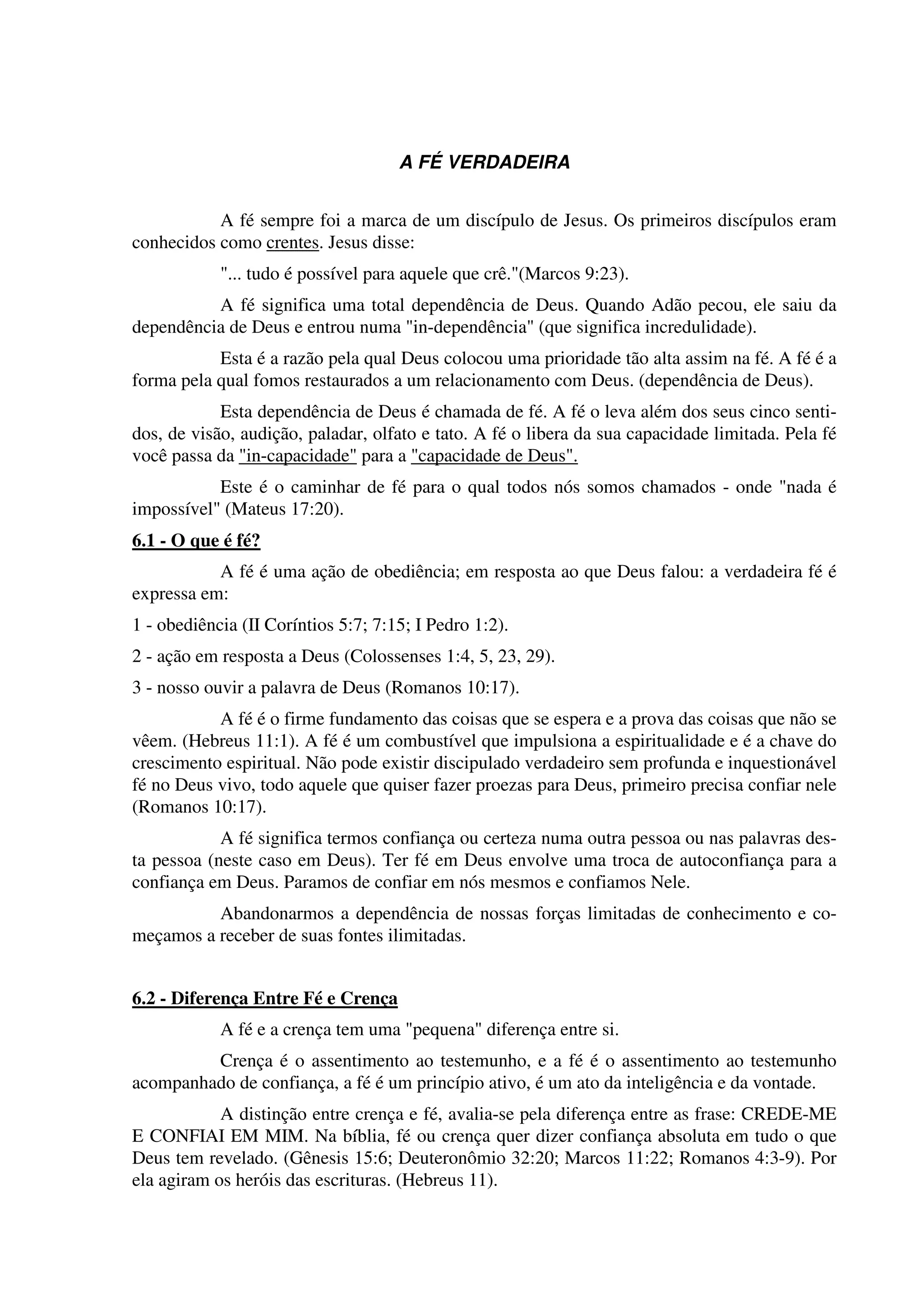 O documento discute a natureza e importância da fé. A fé é total dependência de Deus, restaurando nosso relacionamento com Ele. A fé verdadeira é expressa na obediência a Deus e Sua Palavra. A fé vem de Deus e cresce à medida que ouvimos Sua Palavra e a obedecemos, confiando em Sua fidelidade mesmo nas provas.
