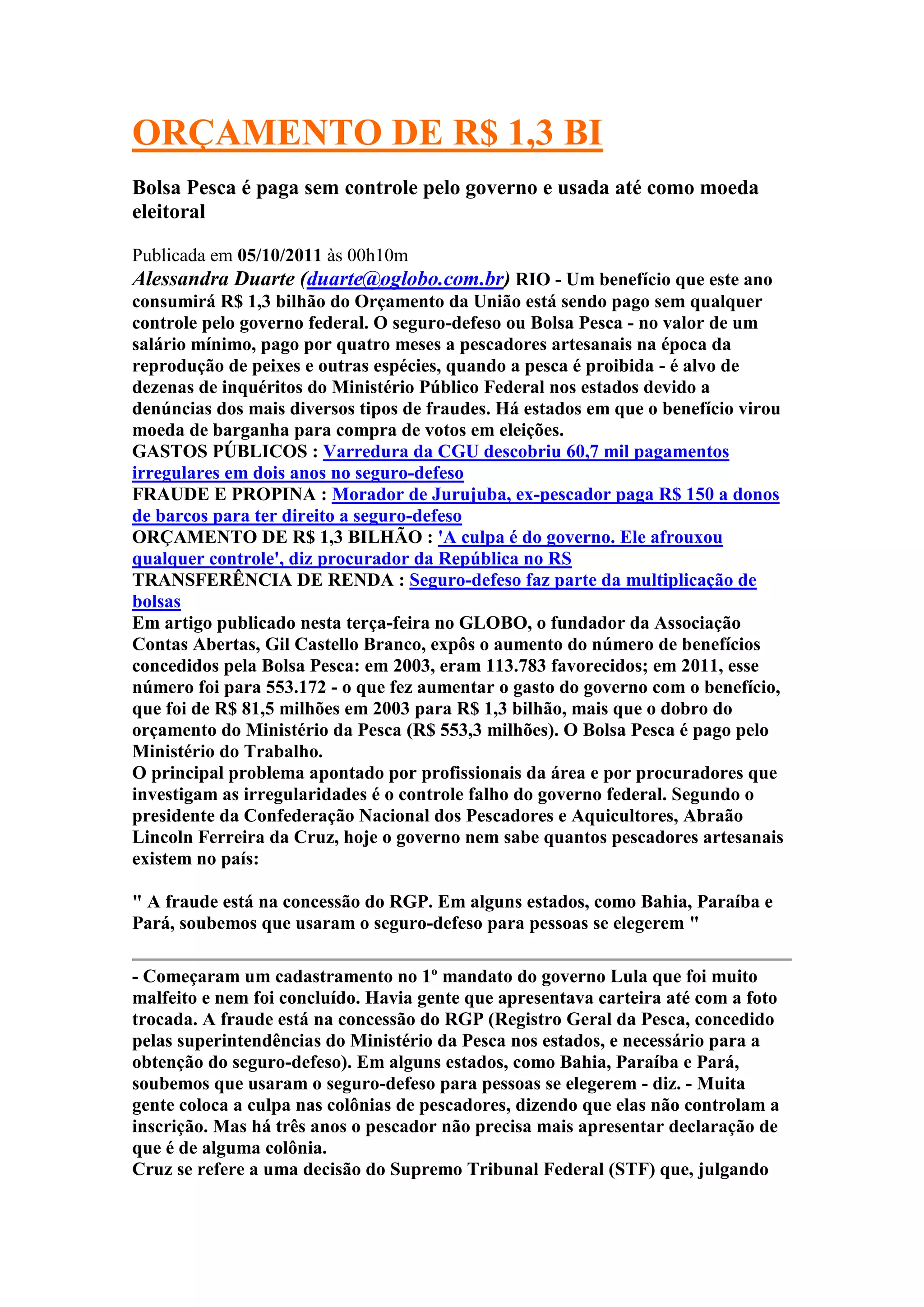 O documento discute as fraudes generalizadas no programa Bolsa Pesca do governo federal, que paga um benefício de um salário mínimo a pescadores artesanais. O programa custou R$ 1,3 bilhão em 2011, mas é concedido sem controle adequado, resultando em pagamentos irregulares. Muitos estados usam o benefício para compra de votos em eleições.