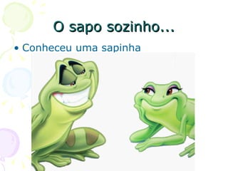 Um sapo solitário conheceu uma sapinha de lábios vermelhos e cílios brilhantes. Eles se gostaram e decidiram ficar juntos, vivendo felizes para sempre.