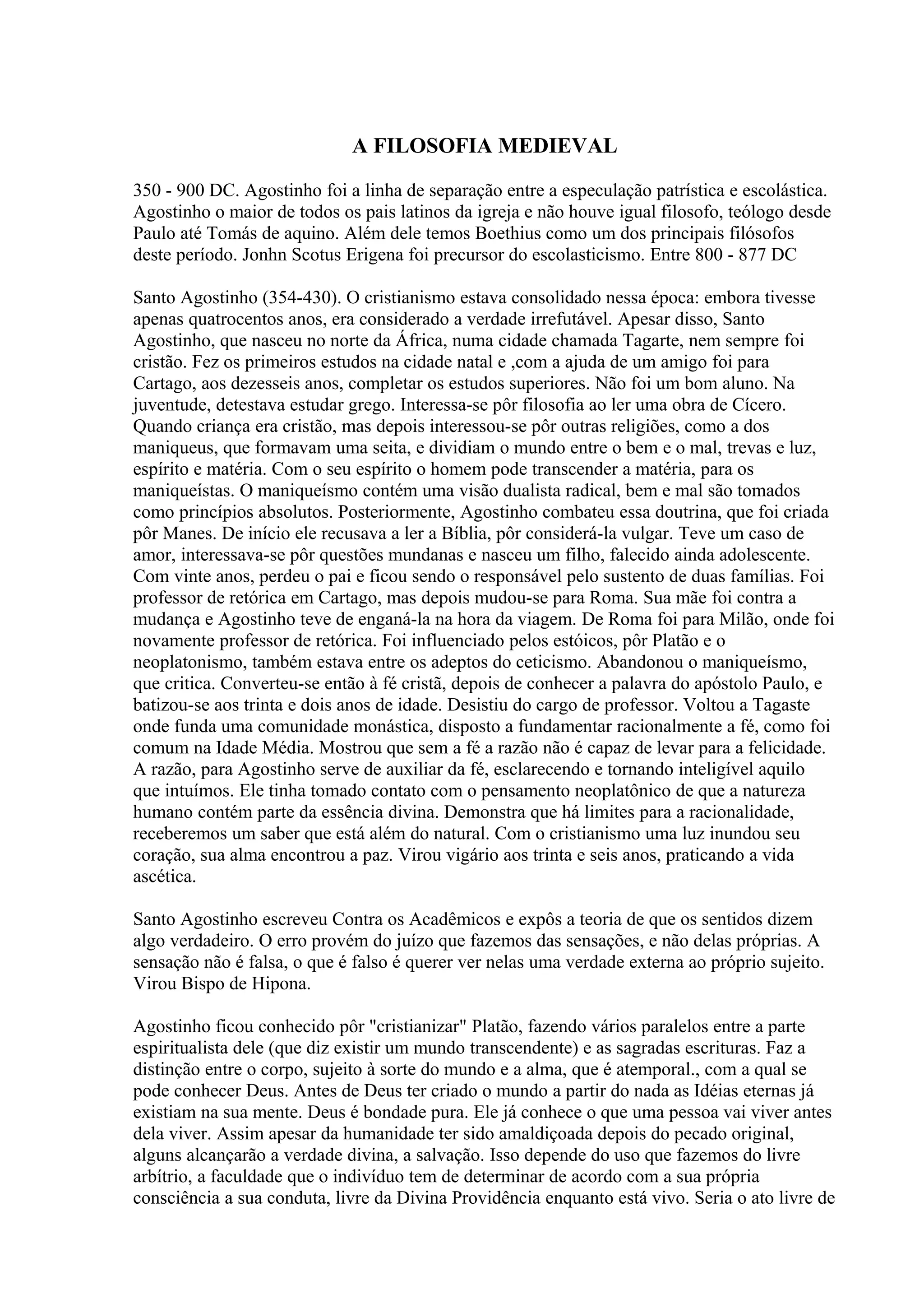 1) O documento descreve a filosofia medieval, com ênfase em Agostinho, Anselmo e Tomás de Aquino, que foram influentes filósofos e teólogos cristãos nesse período.