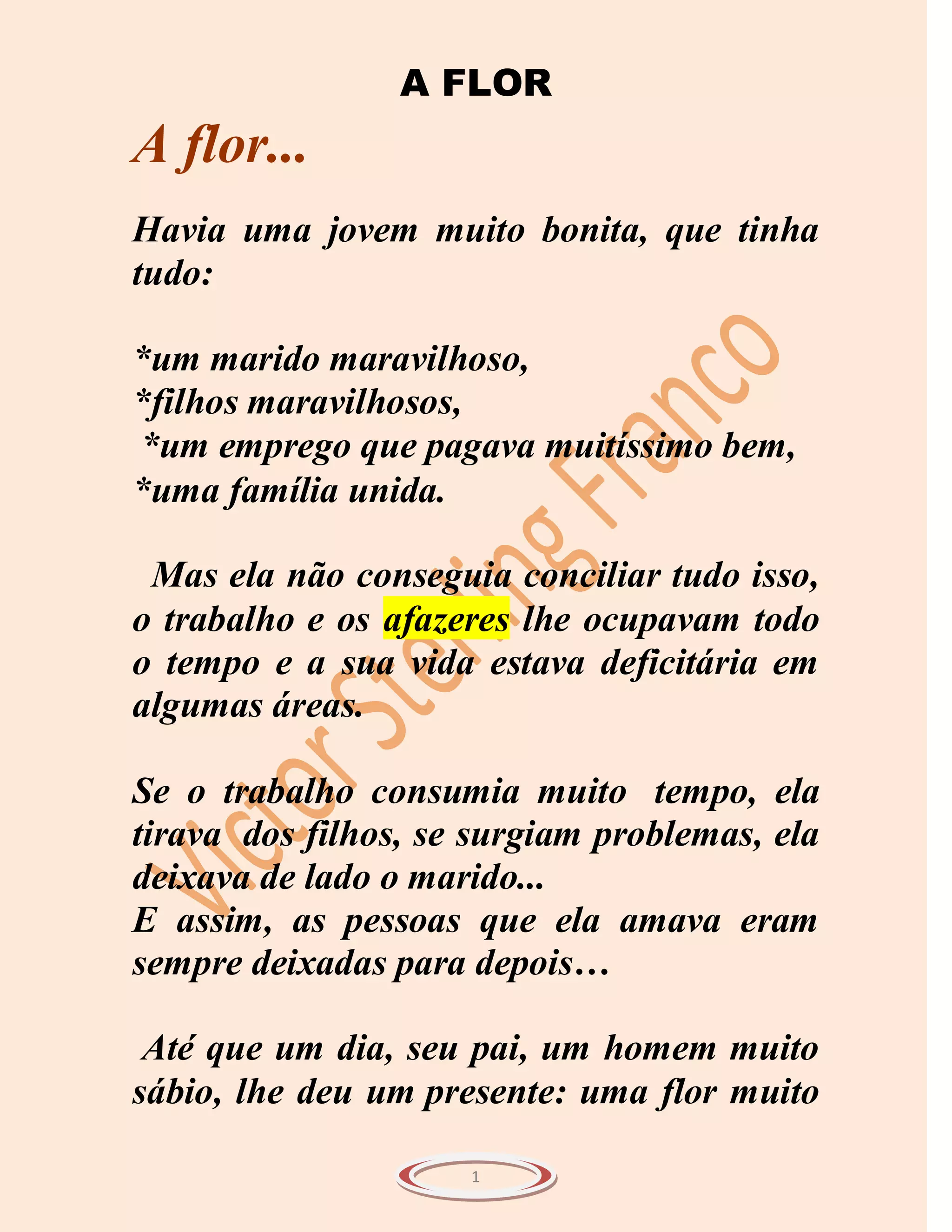 Uma mulher muito ocupada com o trabalho negligenciou cuidar de sua família e de uma flor rara dada por seu pai. A flor morreu, mostrando que os sentimentos e relacionamentos também morrem sem atenção. Seu pai disse que ela deve aprender a cuidar das pessoas amadas em sua vida, assim como deveria ter cuidado da flor.