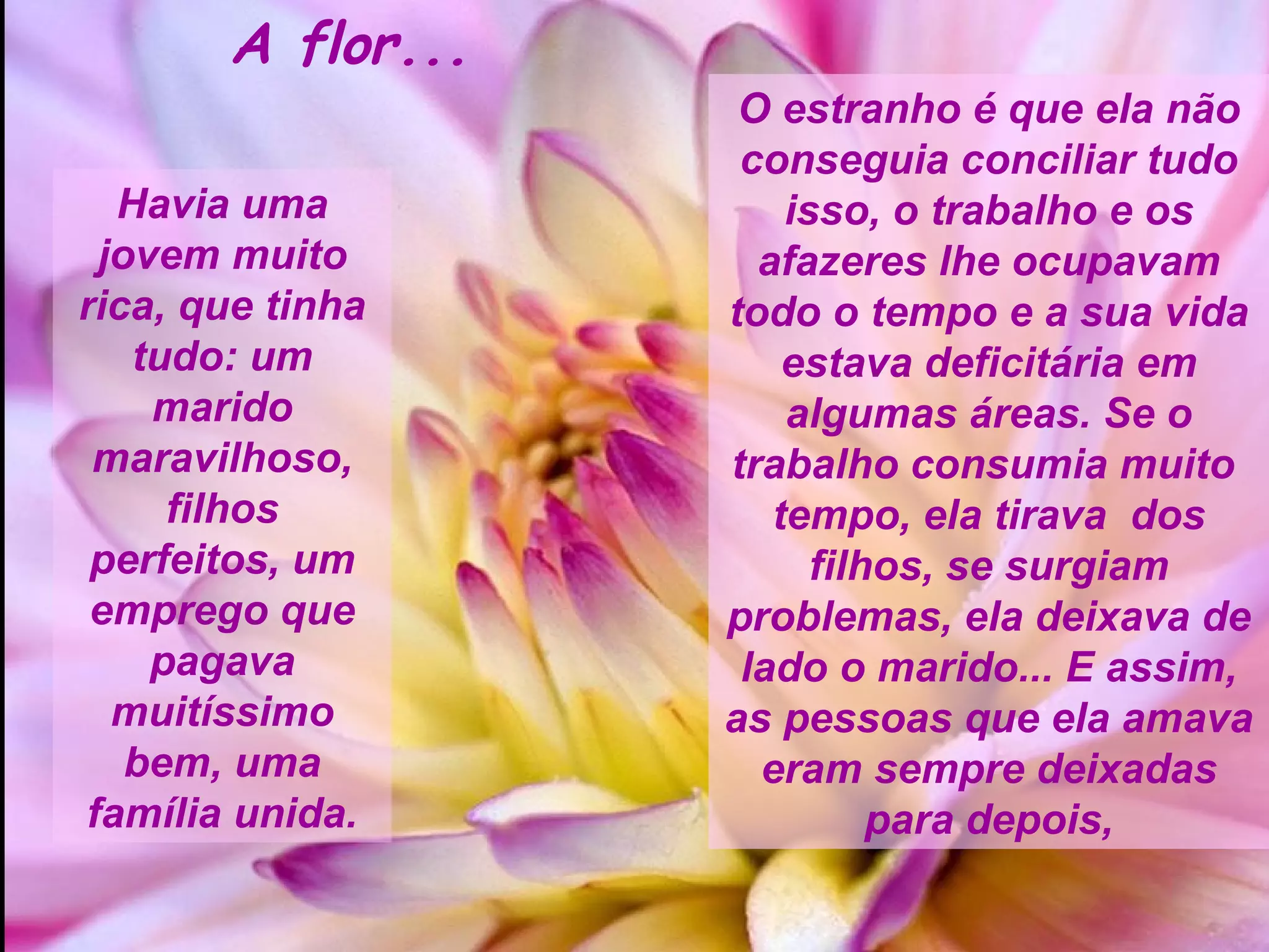 Havia uma jovemmuito rica, que tinha tudo: um marido maravilhoso, filhos perfeitos, um emprego que pagava muitíssimo bem, uma família unida. A flor... O estranho é que ela não conseguia conciliar tudo isso, o trabalho e os afazeres lhe ocupavam todo o tempo e a sua vida estava deficitária em algumas áreas. Se o trabalho consumia muito tempo, ela tirava dos filhos, se surgiam problemas, ela deixava de lado o marido... E assim, as pessoas que ela amava eram sempre deixadas para depois,