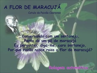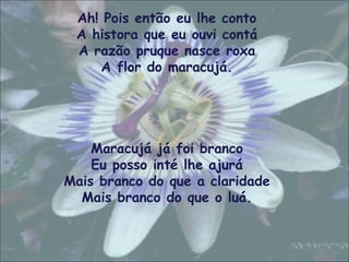 O poema descreve a lenda de que as flores de maracujá eram originalmente brancas, mas se tornaram roxas após o sangue de Jesus Cristo ter tingido as flores próximas à cruz onde ele foi crucificado. O sertanejo explica ao narrador que a natureza inteira chorou diante da cena da crucificação, incluindo as flores de maracujá, que absorveram o sangue de Cristo e por isso nascem roxas desde então.