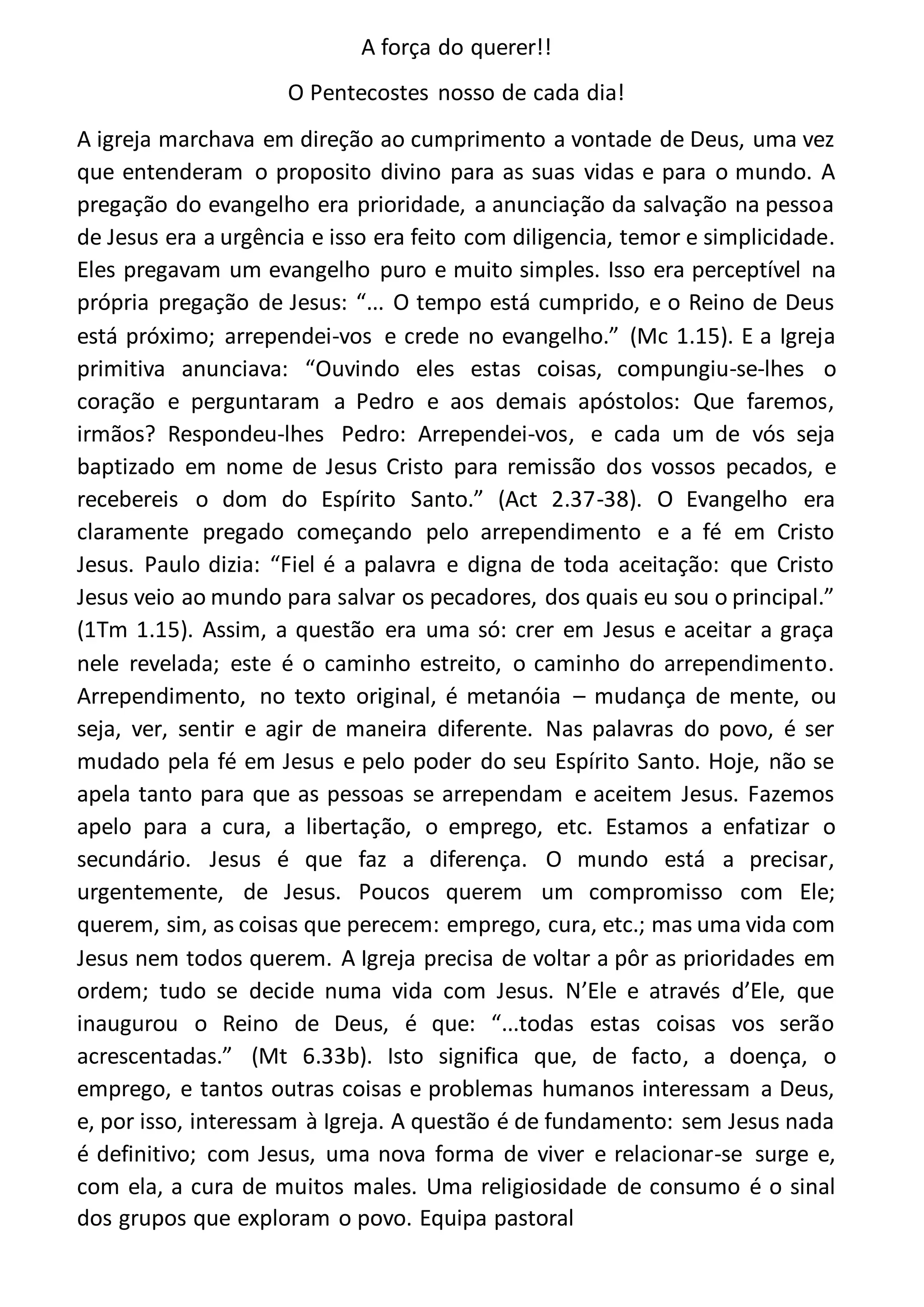 O documento discute como a igreja primitiva se concentrava na pregação do evangelho de Jesus Cristo, enfatizando o arrependimento e a fé. Hoje, a igreja muitas vezes enfatiza coisas secundárias como cura e emprego em vez de Jesus, que é essencial. A igreja precisa voltar a colocar a prioridade em uma vida com Jesus.