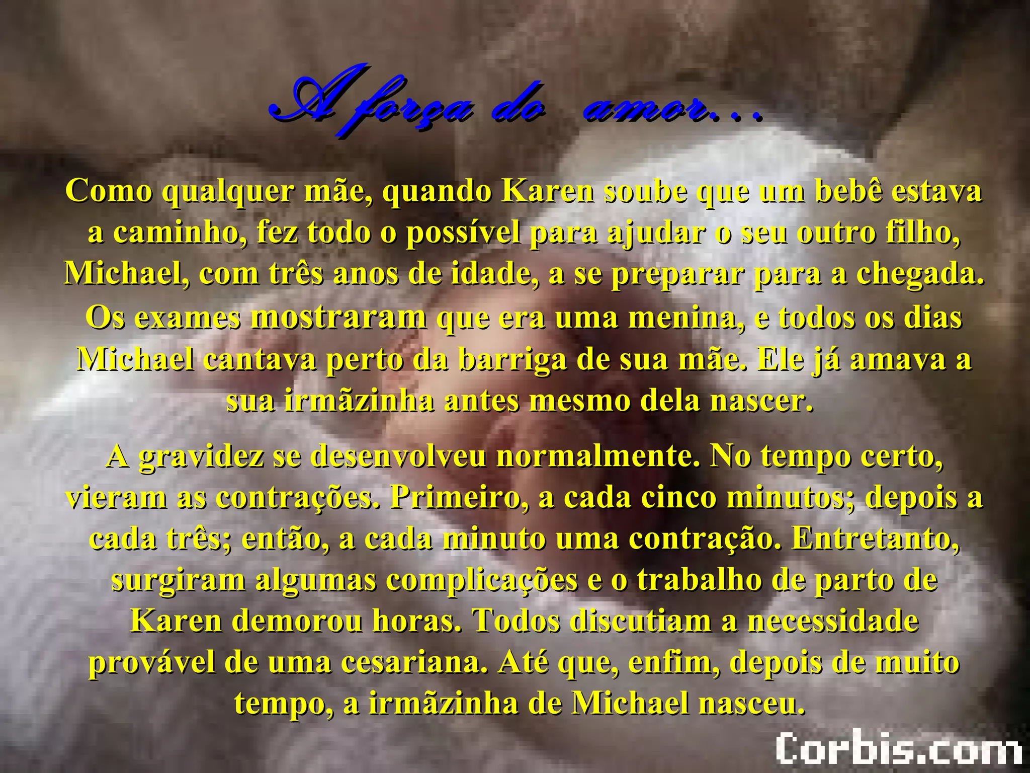 Michael, de 3 anos, cantava para sua irmãzinha no útero de sua mãe Karen. Quando o bebê nasceu, ela estava muito doente e levada para a UTI neonatal. Apesar dos médicos dizerem que ela não sobreviveria, Michael insistia em cantar para ela. Quando Karen levou Michael secretamente para vê-la, ele começou a cantar e o estado de saúde do bebê melhorou, sendo chamado de "milagre da canção do irmão".