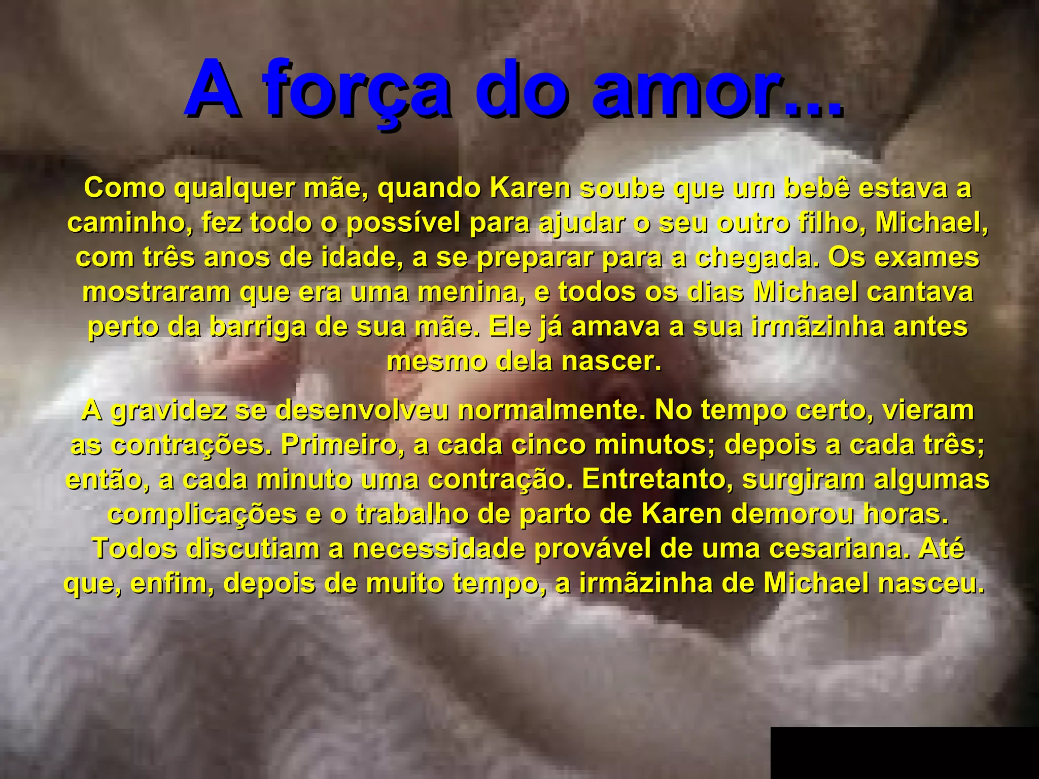 Um menino de 3 anos, Michael, cantava para a barriga de sua mãe grávida enquanto esperava ansiosamente pela chegada de sua irmãzinha. Quando ela nasceu prematuramente, estava muito doente e foi levada para a UTI neonatal. Apesar dos médicos terem pouca esperança, a mãe levou Michael secretamente para vê-la e ele começou a cantar para ela, o que pareceu melhorar seu estado de saúde de forma milagrosa.
