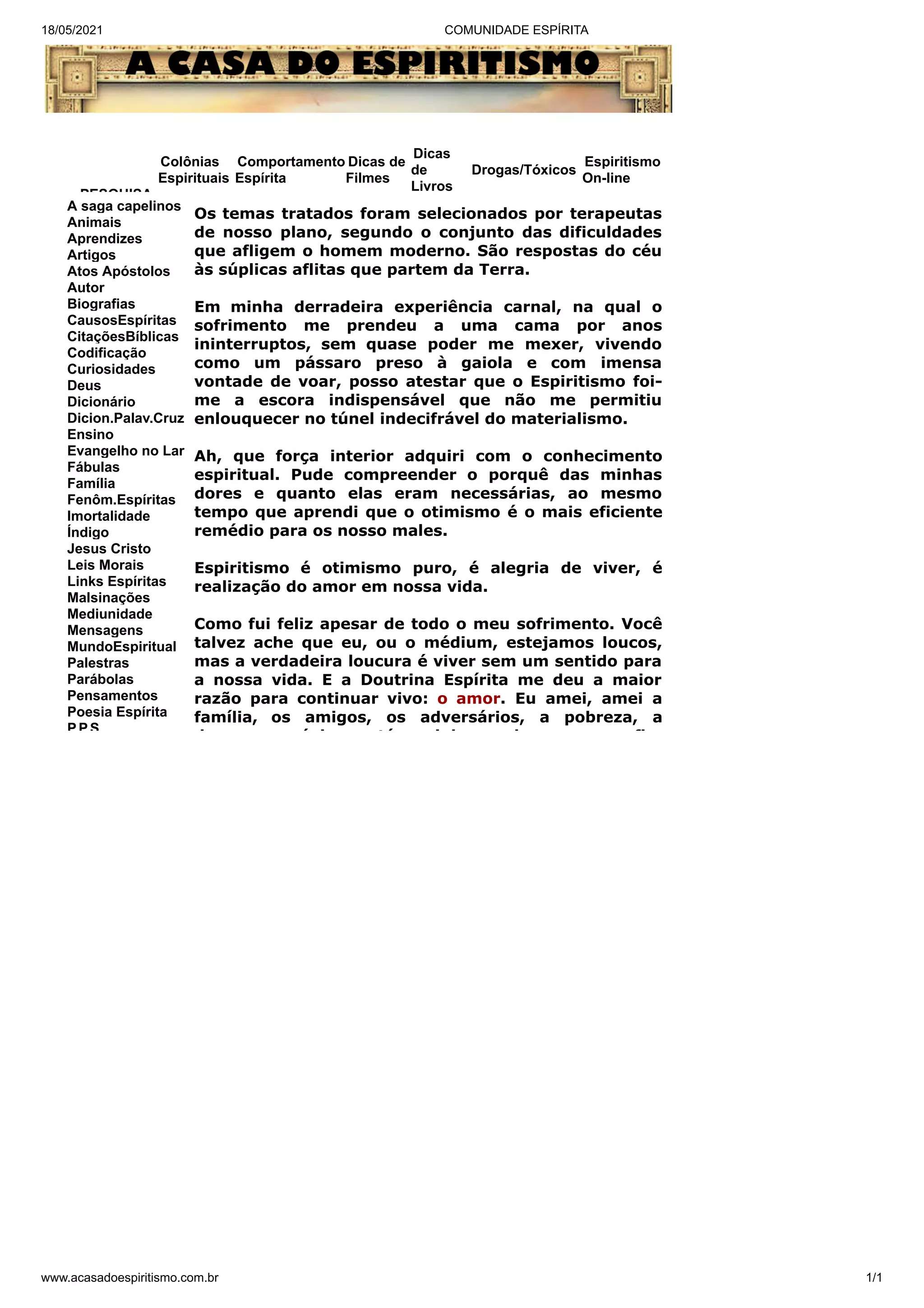 O documento apresenta três parágrafos sobre a experiência de um espírito com o Espiritismo durante uma doença que o prendeu ao leito por anos. No primeiro parágrafo, o espírito descreve como o Espiritismo foi essencial para não enlouquecer durante o sofrimento. No segundo, fala que pôde compreender o propósito de suas dores e aprender que o otimismo é o melhor remédio. No terceiro, resume que o Espiritismo é sinônimo de otimismo, alegria de viver e realização do amor.