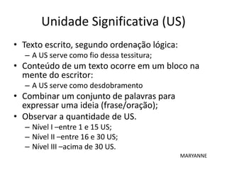 O documento discute a avaliação da competência linguística de crianças em frases, ortografia, pontuação e uso de pronomes. Ele fornece níveis de desempenho para cada habilidade linguística e sugere que os resultados devem ser registrados em um instrumento para análise.