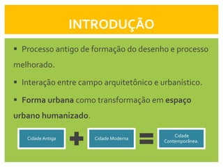 O documento discute a morfologia urbana e a forma da cidade. Apresenta a visão de José Lamas sobre a importância da leitura físico-espacial da cidade e discute como diferentes sistemas como visual, tátil e olfativo influenciam a percepção e compreensão da forma urbana.