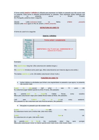 O documento explica a estrutura e uso do used to para expressar hábitos no passado que não ocorrem mais no presente, diferente do simple present para ações habituais atuais. A estrutura é used to + infinitivo e exemplos demonstram como indicar situações passadas que não existem mais.