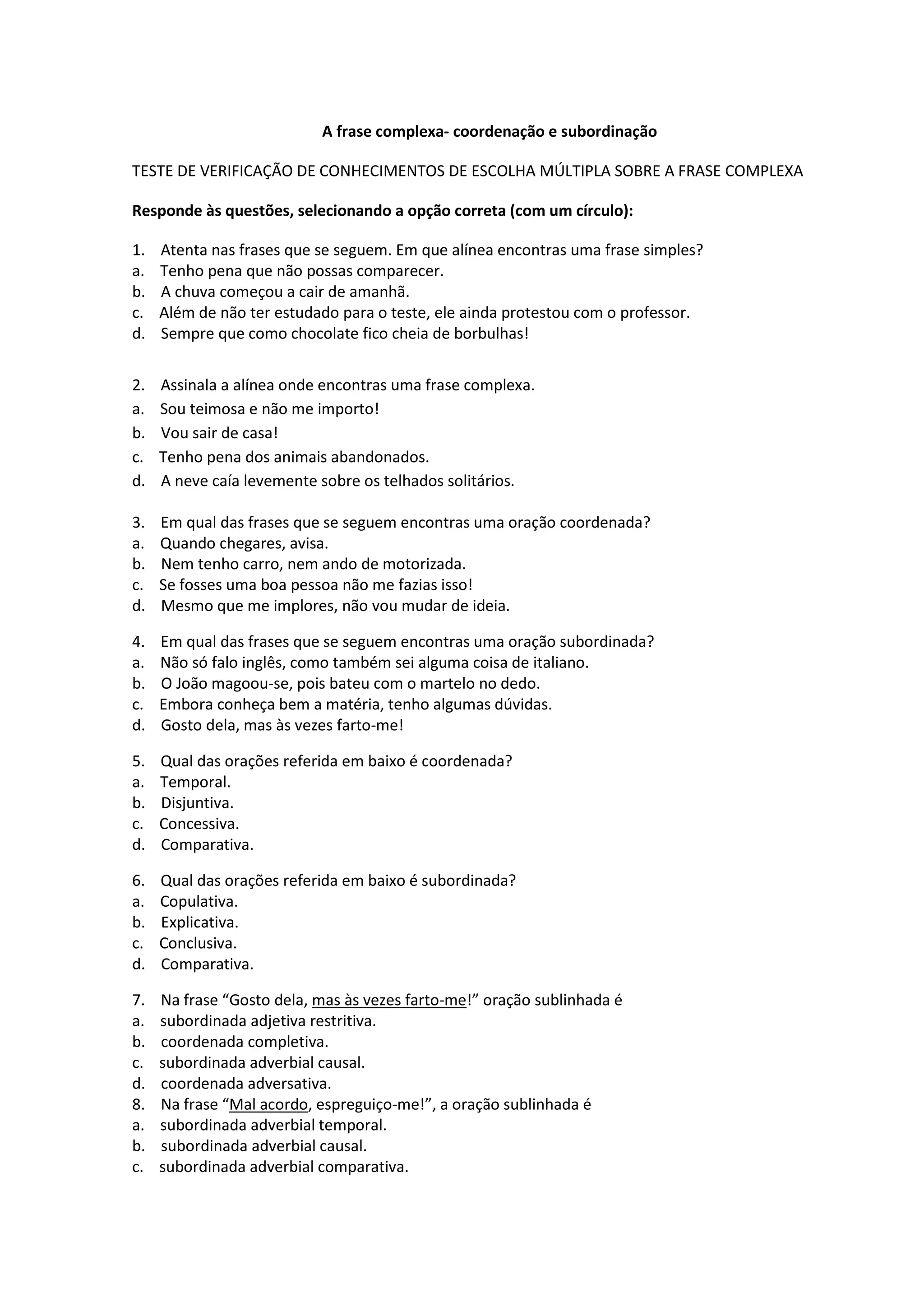 Este documento apresenta um teste de múltipla escolha sobre frases complexas, coordenação e subordinação. O teste contém 15 questões sobre identificar diferentes tipos de orações em frases dadas, como orações coordenadas, subordinadas adverbiais, substantivas e outras.