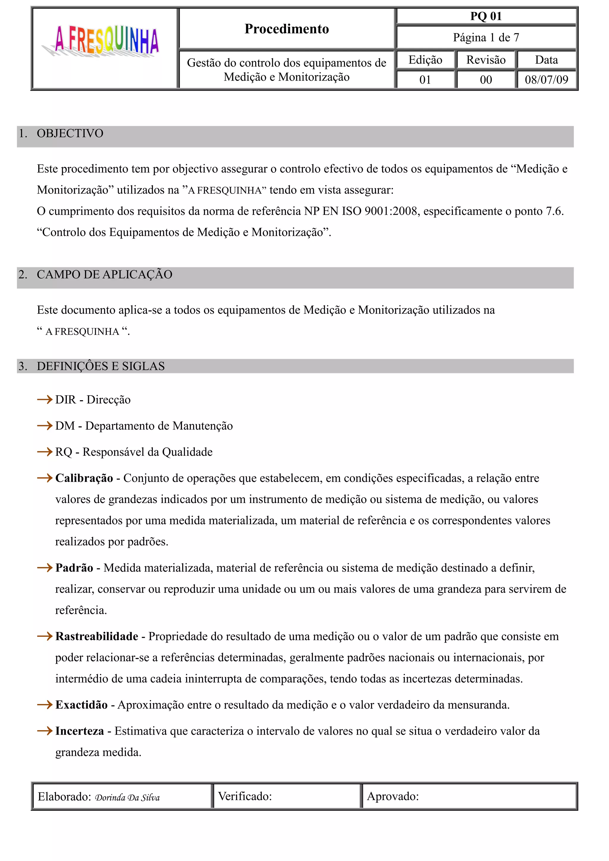 Este procedimento estabelece as diretrizes para o controle e calibração dos equipamentos de medição e monitorização utilizados na empresa A Fresquinha, de acordo com os requisitos da norma NP EN ISO 9001:2008. Define os responsáveis, a frequência de calibração de cada equipamento, os critérios de aceitação e o registro documental necessário.