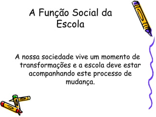 O documento discute a função social da escola de acordo com vários autores. Em 3 frases: A escola deve acompanhar as transformações sociais e preparar os estudantes para serem cidadãos capazes de questionar e participar da sociedade, de acordo com Paulo Freire. A função social da escola é desenvolver competências nos alunos para que se tornem cidadãos plenos e contribuam para melhorar a sociedade, segundo Moran. A escola também deve ajudar a formar os estudantes como profissionais e cidadãos participativos, conforme Torres e Moret