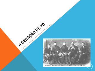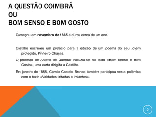 Este documento descreve a Questão Coimbrã, um debate literário que ocorreu em Portugal entre 1865-1866 entre a geração romântica ultraconservadora liderada por António Feliciano de Castilho e a geração contestatária de 1870 liderada por Antero de Quental. O debate envolveu cartas, artigos e até um duelo e levantou questões sobre o papel da literatura na sociedade. A geração de 1870 defendia uma abordagem mais política e socialmente engajada em contraste com o romantismo oficial da g