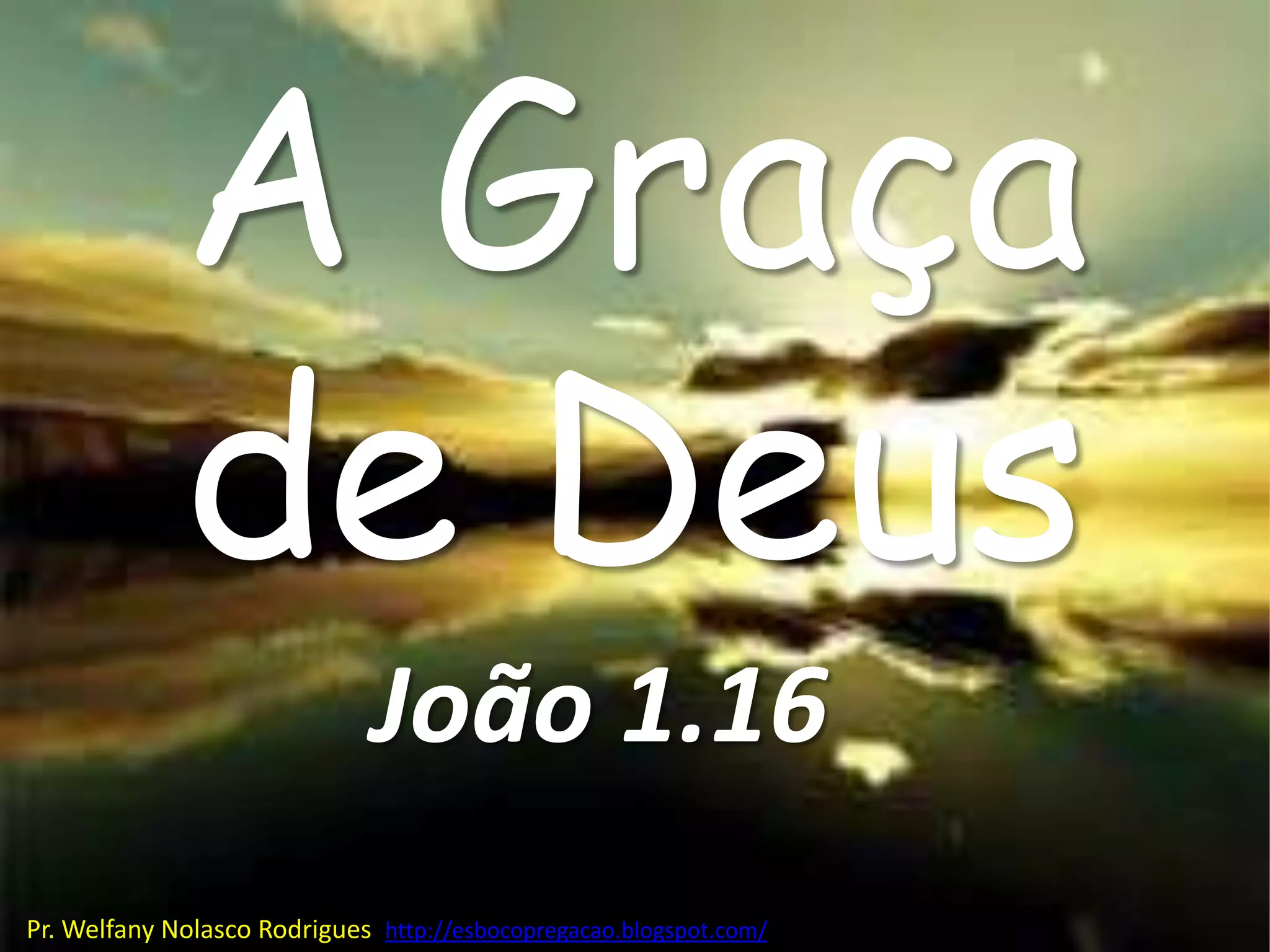 O documento discute as características da graça de Deus, listando doze qualidades como gratuita, viva, para todos, trabalha, rica, suficiente, multiforme, superabundante, justifica, capacita, cresce e firme. O autor reflete sobre como a graça de Deus nos afeta de maneiras positivas.