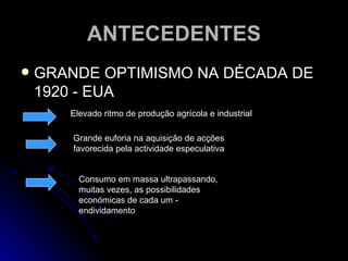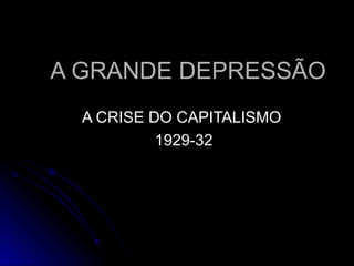 O documento descreve as causas e características da Grande Depressão de 1929-1932. A crise foi causada por superprodução, especulação e quebra da bolsa em 1929, levando a uma crise econômica, financeira e social. Políticas intervencionistas como o New Deal dos EUA ajudaram a sair da crise aumentando empregos e consumo através de obras públicas e controle da produção.