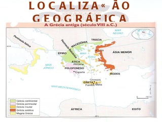 O documento resume a história da Grécia Antiga, desde a imigração indo-européia no período pré-homérico até o período helenístico após as conquistas de Alexandre Magno. Aborda aspectos como as primeiras civilizações gregas, o surgimento das pólis como Atenas e Esparta, as guerras médicas, a democracia ateniense, e a influência da Macedônia sobre a Grécia.